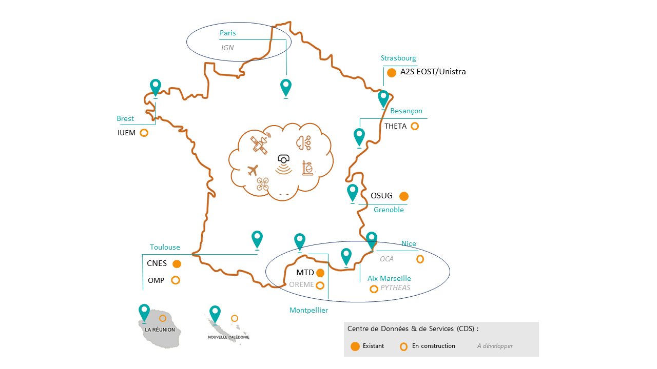 THEIA dispose de quatre Centres de Données d’Observation et de Services (CD.O.S) — Toulouse, Montpellier, Strasbourg et Grenoble. Cette structure distribuée offre des capacités de traitement diversifiées et un accès à un large panel de données, produits et de services issus des CES. Les CD.O;S fournissent les moyens de production et de diffusion nécessaires aux projets retenus via l’AAP THEIA.